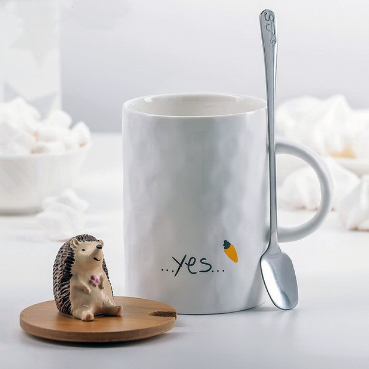 Кружка "Yes" з задоволеним їжачком на дерев'яній кришці з ложкою 375 мл